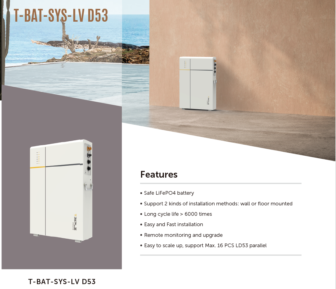 Il T-BAT-SYS-LV D53 di SolaX Power è un avanzato sistema di accumulo energetico residenziale che utilizza batterie LiFePO₄ sicure e durevoli, con una capacità modulare che varia da 5,3 kWh fino a 85,1 kWh, permettendo l’installazione fino a 16 unità in parallelo.