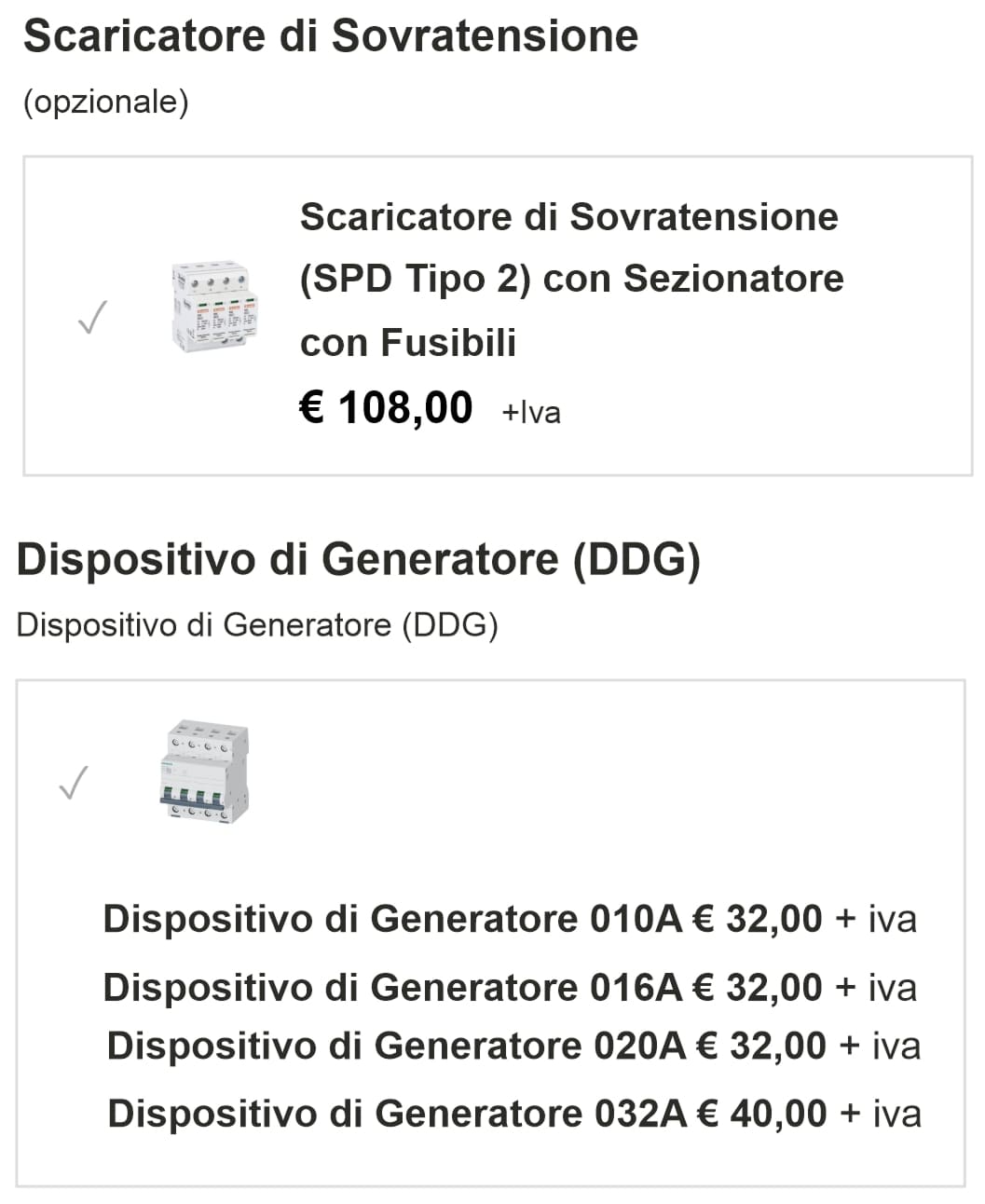 - Dispositivo di Generatore (DDG): Interruttore magnetotermico in curva C, 4P e potere di interruzione di 6kA