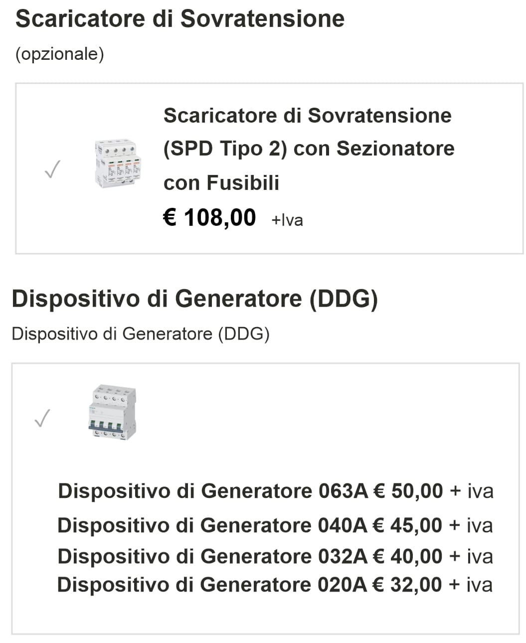 - Dispositivo di Generatore (DDG): Interruttore magnetotermico in curva C, 4P e potere di interruzione di 6kA