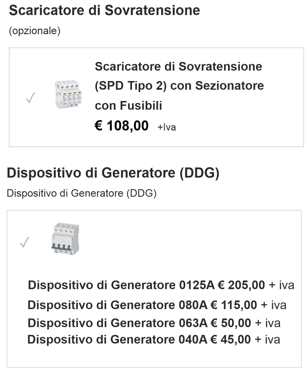 • Dispositivo di Generatore (DDG): Interruttore magnetotermico in curva C, 4P e potere di interruzione di 6kA