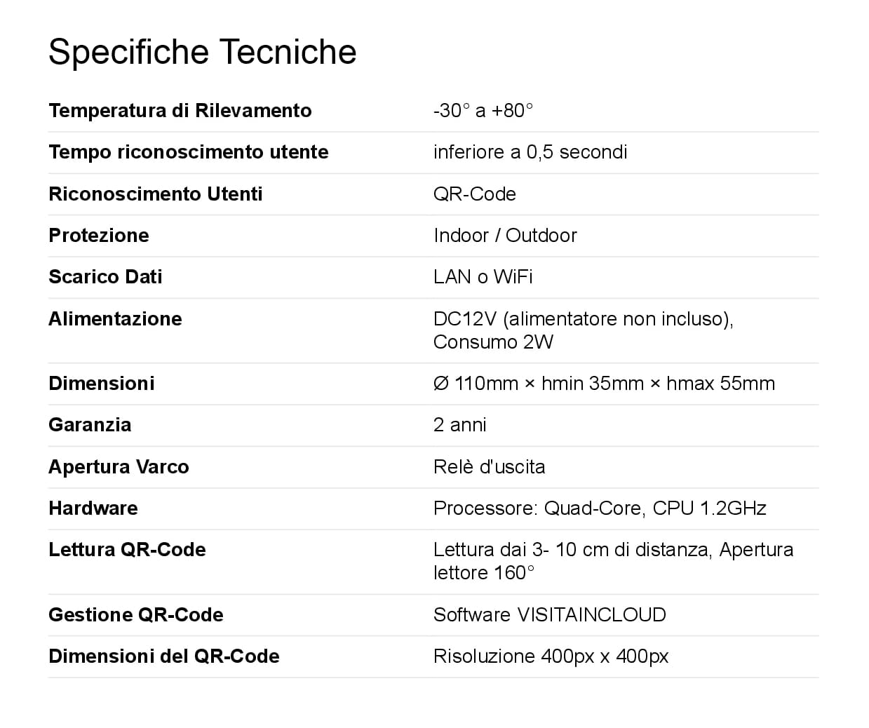 Il sistema consente inoltre di generare, gestire e trasmettere QR-Code personalizzati (inviabili via email in formato JPG o PDF oppure stampabili) con una durata configurabile da 1 ora fino a 170 giorni.